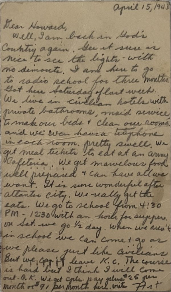 Well, I am back in God’s Country again. Gee it sure is nice to see the lights – with no dimouts. I am here to go to radio school for three months. Got here Saturday of last week.