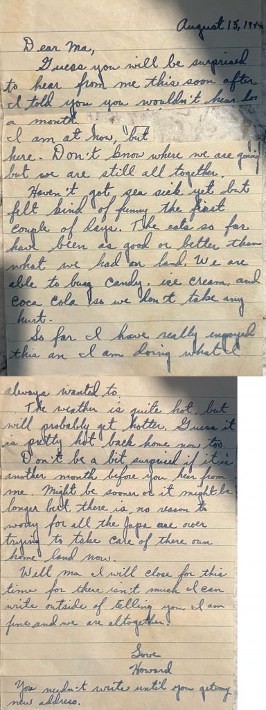* I am at now, but * here. Don’t know where we are going but we are still all together. Haven’t got sea sick yet but felt kind of funny the first couple of days. The eats so far have been as good or better than what we had on land. We are able to buy Candy, ice cream, and Coca Cola. Yes we don’t take any hurt.