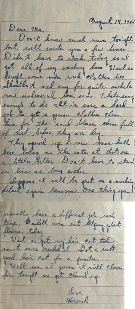 Don’t know much news tonight but will write you a few lines. Didn’t have to work today as I got all of my washing done. Went and bought some more work clothes too. Shouldn’t need any for quite awhile now unless I do some. That’s easy enough to do. It is sure a hard job to get a person clothes clean here for the wind blows them full of dirt before they are dry.