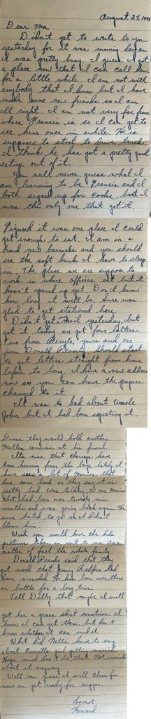 Didn’t get to write to you yesterday for it was moving day on a place now that I guess I got settled for a little while. I can call home and I am not with anybody that I know but I have made some new friends so I am all right. I am not very far from where Francis is so I can get to see him once in awhile. He is supposed to start to drive truck, I think he has got a pretty good setup out of it. You will never guess what I am learning to be. Francis and I both signed up for cooks, but I was the only one that got it.