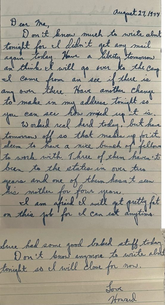 Don’t know much to write about tonight for I didn’t get any mail again today. Have a Liberty tomorrow and think I will go over to the Camp I came from and see if there is any over there. Have another change to make in my address tonight so you can see how mixed up it is. I worked real hard today, but have tomorrow off so that makes up for it. Seem to have a nice bunch of fellows to work with. Three of them haven’t been to the States in over two years and one of them hasn’t seen his mother for four years. I am afraid I will get pretty fat on this job for I can eat anytime.
