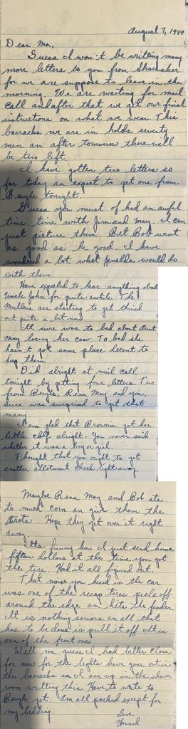 Guess I won’t be writing many more letters to you from Shoemaker for we are supposed to leave in the morning. We are waiting for mail call and after that we get our final instructions on what we wear. This barracks we are in holds seventy men and after tomorrow there will be two left.