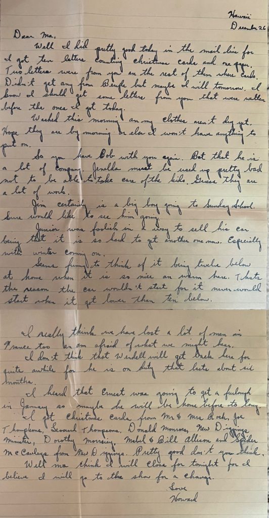 Well I did pretty good today in the mail line for I got ten letters counting Christmas cards and one paper. Two letters were from you and the rest of them were cards. Didn’t get any from Bude but maybe I will tomorrow. I know I should get some letters from you that were written before the ones I got today.