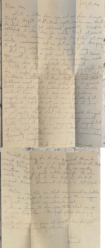 Its too bad about Ray getting in a fight. He has an awful quick temper anyhow. I knew that he drank a little. I knew that him and that Judkins went with her first, but Judkins went with her the last I knew. Don’t care much for Judkins myself. I really believe it was a good thing it happened before he got in service for it is a pretty serious offense fighting in here.