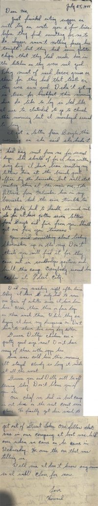 I got a letter from Beryle this morning and she said she hadn’t had any mail from me for several days. She should of for I have written every day. I have been mailing my letters here at the branch post office by the barracks, but will start mailing them at the main one. The fellows from Milwaukee here in my barracks had the same trouble too. Its pretty hard to handle so much mail so far. I have gotten seven letters from Beryle and five from you. Shall get one from you tomorrow.