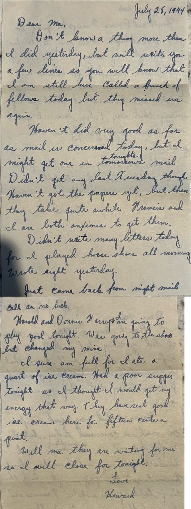 Haven’t did very good as far as mail is concerned today, but I might get one in tomorrows mail. Didn’t get any last Tuesday though. Haven’t got the papers yet, but then they take quite awhile. Francis and I are both anxious to get them. Didn’t write many letters today for I played horse shoes all morning. Wrote eight yesterday.