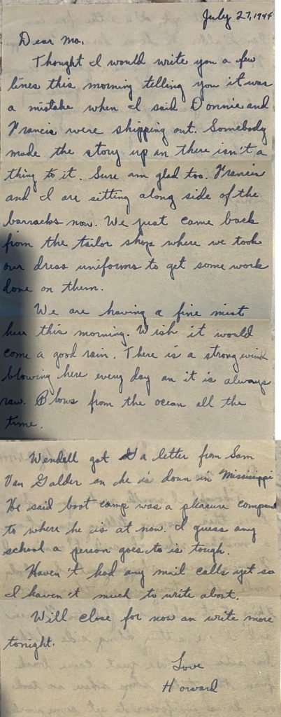 Wendell got a letter from Sam Van Galder an he is down in Mississippi. He said boot camp was a pleasure compared to where he is at now. I guess any school a person goes to is tough. Haven’t had any mail calls yet so I haven’t much to write about. Will close for now an write more tonight.