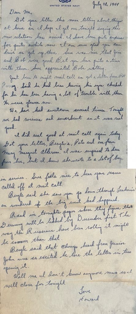 I did real good at mail call again today. Got your letter, Beryle’s, Pats and one from Mary Margret Alderson. I was surprised to hear from her, but I know she wrote to a lot of boys in service. Sure feels nice to hear your name called off at mail call.