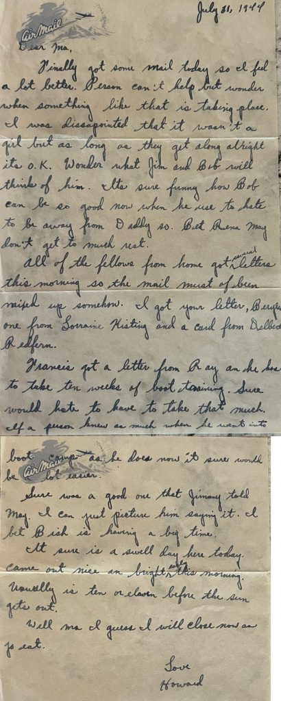 All of the fellows from home got several letters this morning so the mail must of been mixed up somehow. I got your letter, Beryle, one from Lorraine Histing and a card from Delbed Redfern.