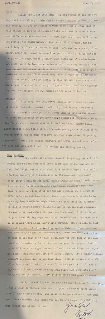 I’ll only be here for four more weeks or so but I can’t say I’ll miss leaving this joint. I’ve seen it but nothing like it is here. We take 2 salt pills at breakfast, one at ten P.M., two at dinner time, one at 3 P.M. and two again for supper but we sure need them. The food was awful at first but we have a new mess sgt and we get a lot of milk, peanut-butter and larger flat fulls of hash. We still have fish on Fridays (being I’m next to Irish I shouldn’t complain) and that’s about all you can smell & taste for the week end. Our barracks are old ones and not very well kept up. The bed bugs are really thick in but we have to fight our way into bed with G.I. Boots. I told Ray that there was so many of them that they shake the bed almost as bad as a chevrolet car does at 70MPH. Those little devils can bite enough too.