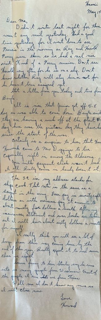 Didn’t write last night for there wasn’t any mail yesterday. Had a good time yesterday for I went down to see Francis in the morning and Ray and Harold Parrey were there so we had a real nice visit. Kind of a Parrey reunion. Don’t see Harold very often for he is on a ship. Don’t know whether Ray will stay here or not for he hasn’t been assigned yet.