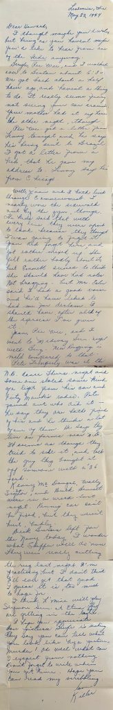 Beryle, Pee Wee, and I walked over to Benton about 6:30. We got back about a half hour ago, and haven’t a thing to do. It really seems funny not seeing your car around. Your mother had it up here the other night, though. Pee Wee got a letter from Lenny tonight and he says he’s being sent to Brazil. I got a letter from a kid that he gave my address to. Lenny says he’s from Chicago.