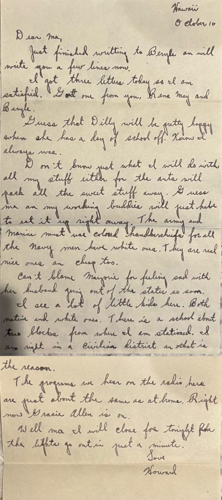 I don’t know just what I will do with all my stuff either for the ants will pack all the sweet stuff away. I guess me and my working buddies will just have to eat it up right away. The army and Marine men must use colored Handkerchiefs for all the Navy men have white ones. They are real nice ones and cheap too.