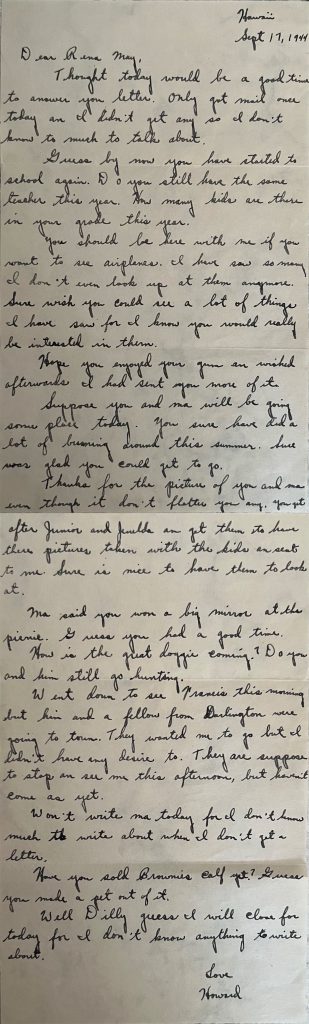 Went down to see Francis this morning but him and a fellow from Darlington were going to town. They wanted me to go but I didn’t have any desire to. They are suppose to stop an see me this afternoon, but haven’t come as yet. Won’t write ma today for I don’t know much to write about when I don’t get a letter.