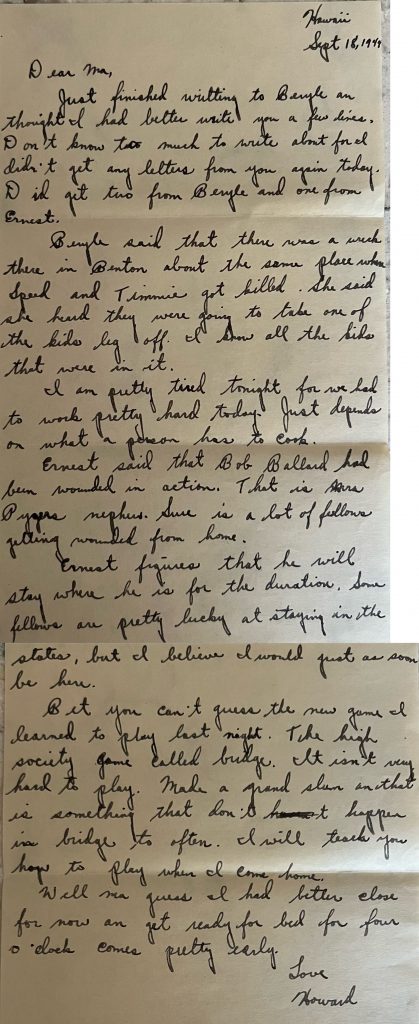 I am pretty tired tonight for we had to work pretty hard today. Just depends on what a person has to cook. Ernest said that Bob Ballard had been wounded in action. That is Sara Pippen nephew. Sure is a lot of fellows getting wounded from home. Ernest figures that he will stay where he is for the duration, some fellows are pretty lucky at staying in the states, but I believe I would just as soon be here.