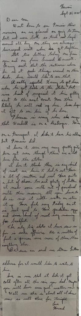 I don’t think there is any kind of meat we haven’t had to eat! Have a lot of mutton and veal. Have quite a bit of cheese too and plenty of butter. I made some milk out of powdered milk this morning. All you have to do is mix it with water an stir it up. Have fish every Friday an it is real good too. Have pancakes, eggs and some kind of meat every morning for breakfast.