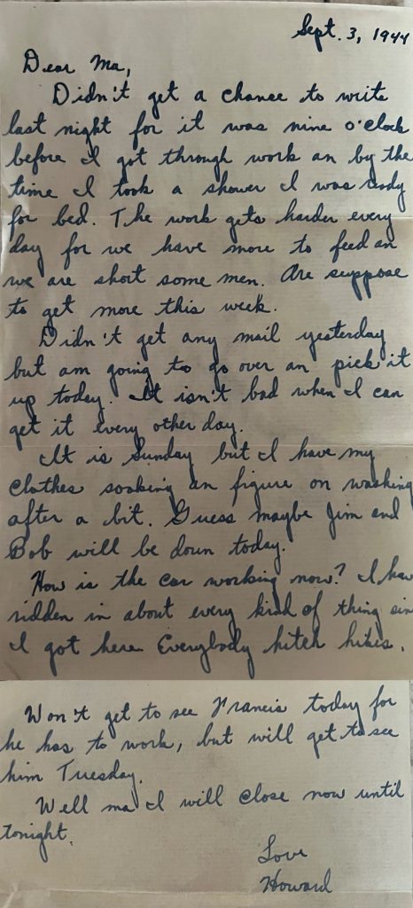 Didn’t get a chance to write last night for it was nine o’clock before I got through work and by the time I took a shower I was ready for bed. The work gets harder every day for we have more to feed and we are short some men. Are suppose to get more this week.