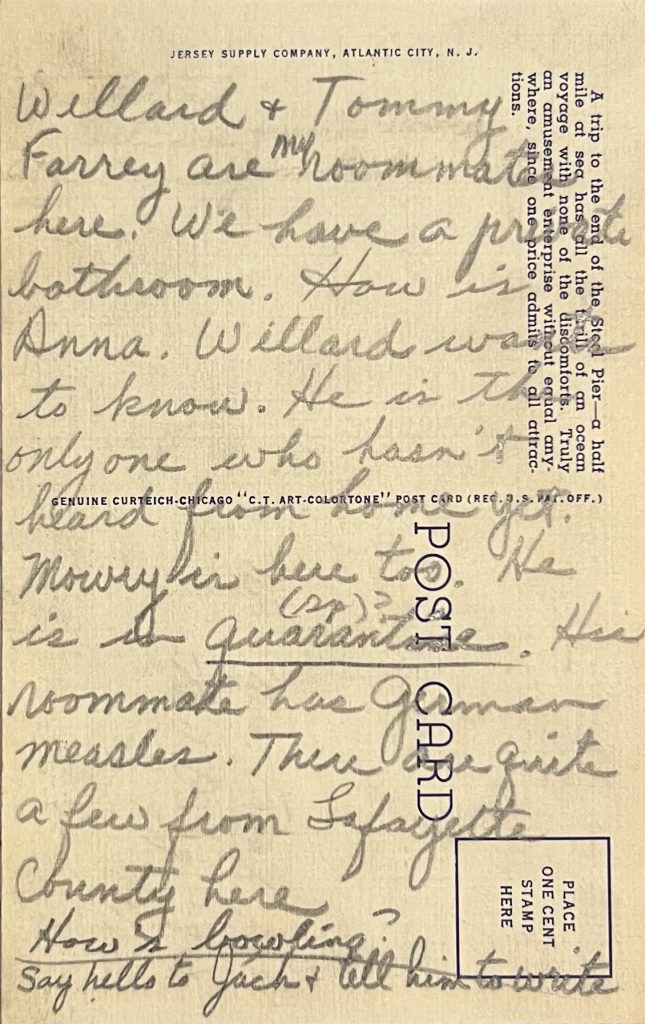 Willard & Tommy Farrey are my roommates here. We have a private bathroom. How is Anna? Willard wants to know. He is the only one who hasn’t heard from home yet. Mowry is here too. He is in quarantine. His roommate has German measles. There are quite a few from Lafayette County here. How is gasoline? Say hello to Jack & tell him to write.